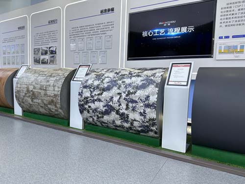 印花彩涂板是以冷轧钢板或镀锌钢板或镀铝锌钢板为基板,经过表面预处理(脱脂、清洗、化学转化处理、烘烤),以连续的生产方法辊涂上需要的花色纹理,经过烘烤和冷却而成的产品。比较标准的三涂三烘型连续印花涂层工艺流程主要生产工序为:开卷一预处理一底涂一烘烤一面涂→烘烤一印刷清漆一烘烤一后处理一收卷。 那些不同的纹理木纹,迷彩等纹理彩涂板就是在印刷那一道生产工艺中体现的,可以根据客户的要求专业定制出各种不同的纹理图案。